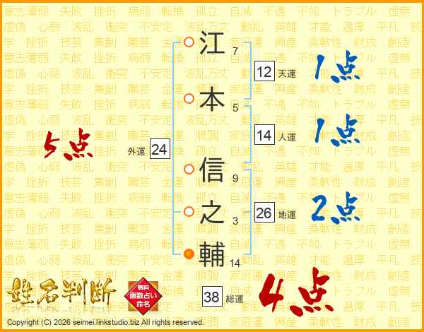 江(7画)本(5画) 信(9画)之(3画)輔(14画)