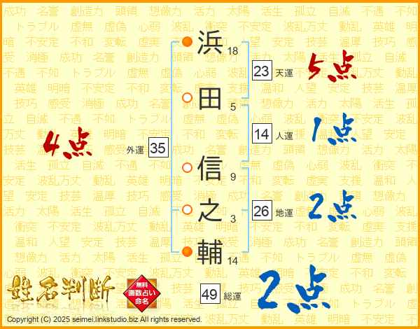 浜(18画)田(5画) 信(9画)之(3画)輔(14画)