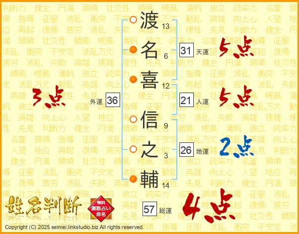 渡(13画)名(6画)喜(12画) 信(9画)之(3画)輔(14画)