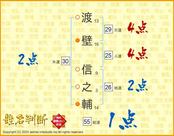 渡壁信之輔さんの人運は25画の4点!