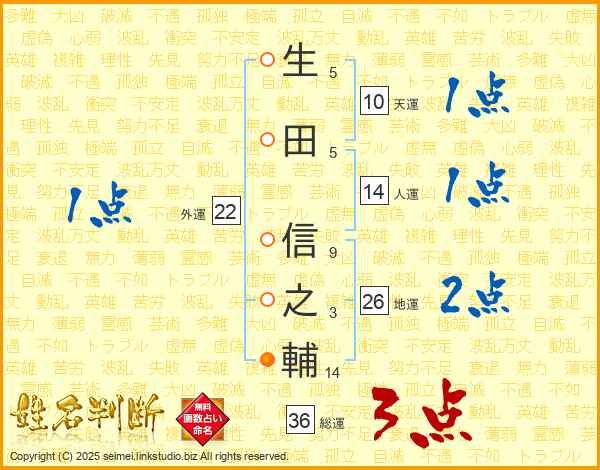 生(5画)田(5画) 信(9画)之(3画)輔(14画)