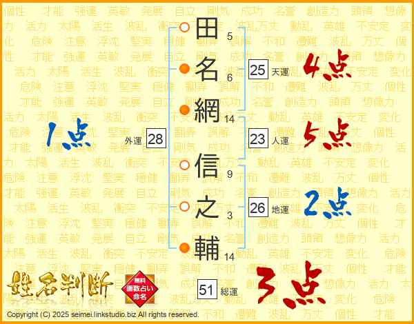 田(5画)名(6画)網(14画) 信(9画)之(3画)輔(14画)