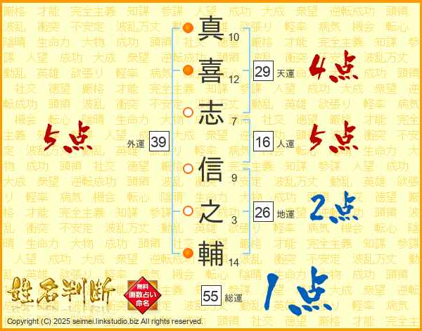 真(10画)喜(12画)志(7画) 信(9画)之(3画)輔(14画)
