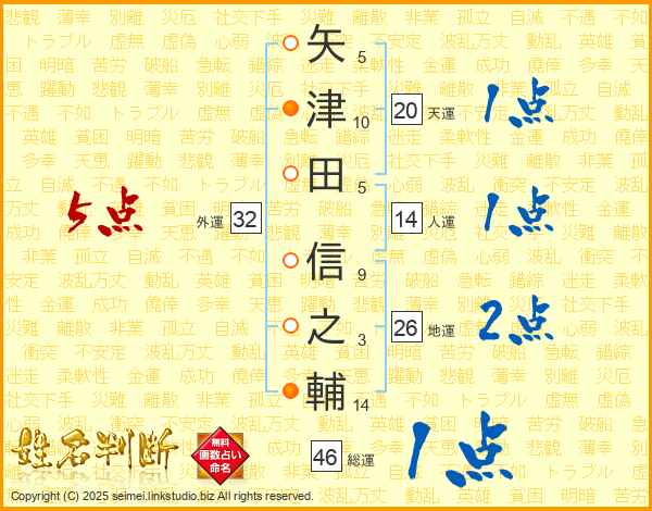 矢(5画)津(10画)田(5画) 信(9画)之(3画)輔(14画)