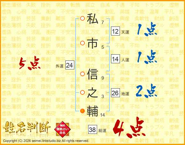 私(7画)市(5画) 信(9画)之(3画)輔(14画)