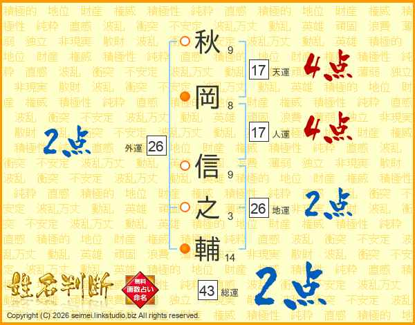 秋(9画)岡(8画) 信(9画)之(3画)輔(14画)