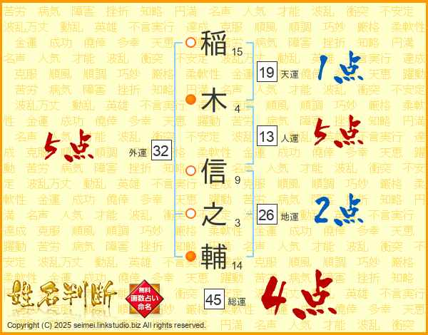 稲(15画)木(4画) 信(9画)之(3画)輔(14画)
