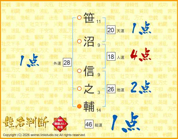 笹(11画)沼(9画) 信(9画)之(3画)輔(14画)