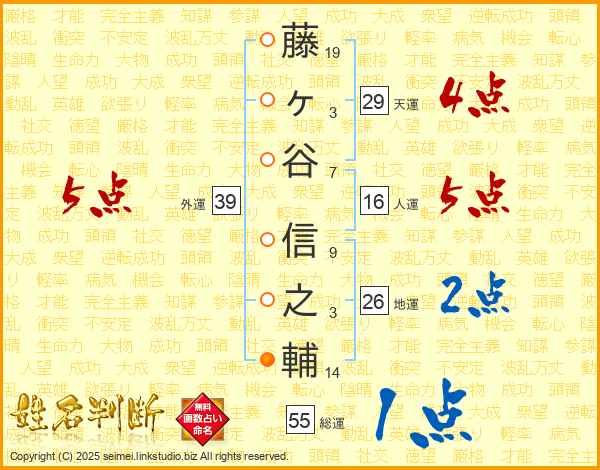 藤(19画)ヶ(3画)谷(7画) 信(9画)之(3画)輔(14画)