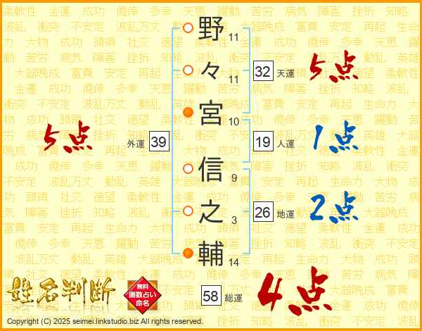 野(11画)々(11画)宮(10画) 信(9画)之(3画)輔(14画)