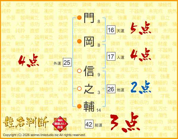 門(8画)岡(8画) 信(9画)之(3画)輔(14画)