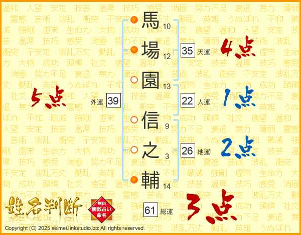 馬(10画)場(12画)園(13画) 信(9画)之(3画)輔(14画)