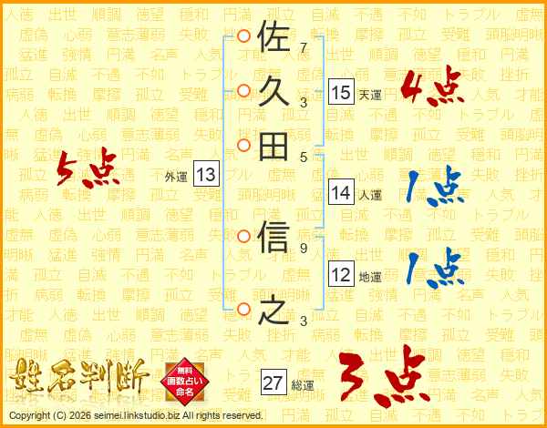 佐久田信之さんの総運は27画の3点!
