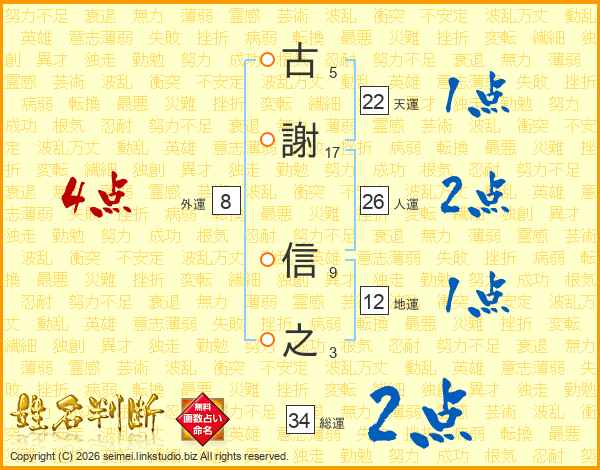 画数の奇数(○陽)と偶数(●陰)の配列で吉凶を占います。どちらかにかたよる名前は大凶名で避ける必要があります。画数の奇数偶数。