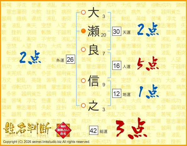 大(3画)瀬(20画)良(7画) 信(9画)之(3画)