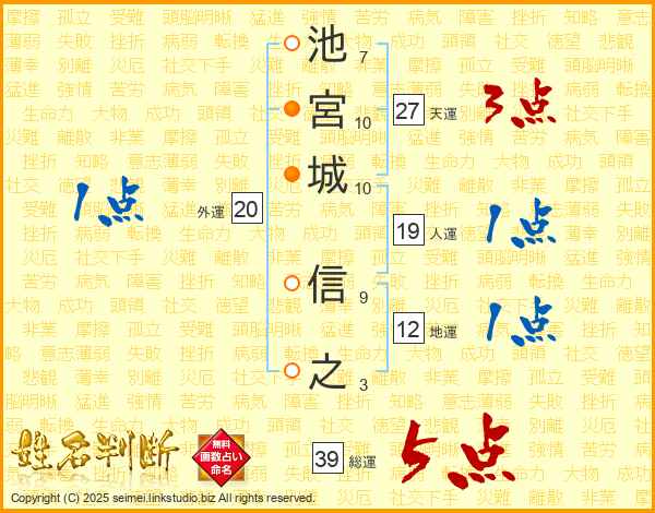 池(7画)宮(10画)城(10画) 信(9画)之(3画)