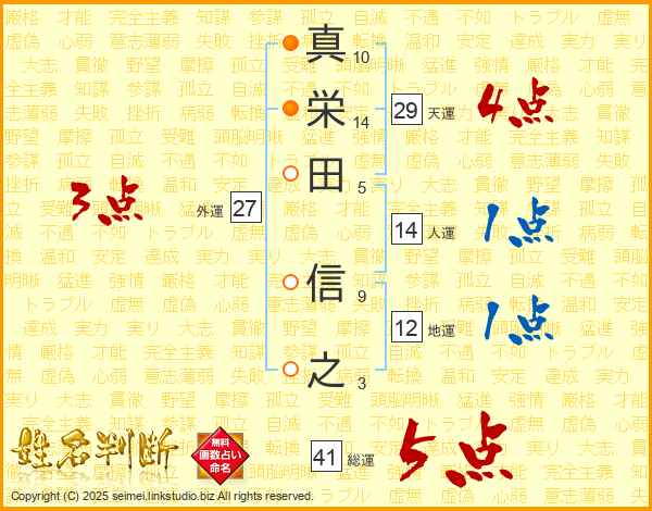 真栄田信之さんの総運は41画の5点!