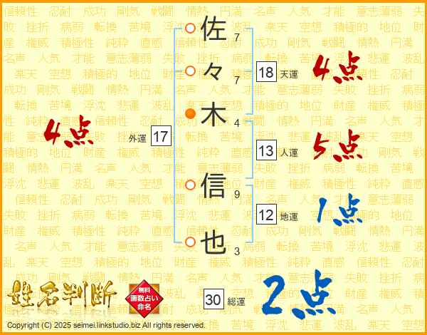 佐(7画)々(7画)木(4画) 信(9画)也(3画)