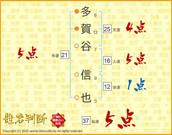 多(6画)賀(12画)谷(7画) 信(9画)也(3画)