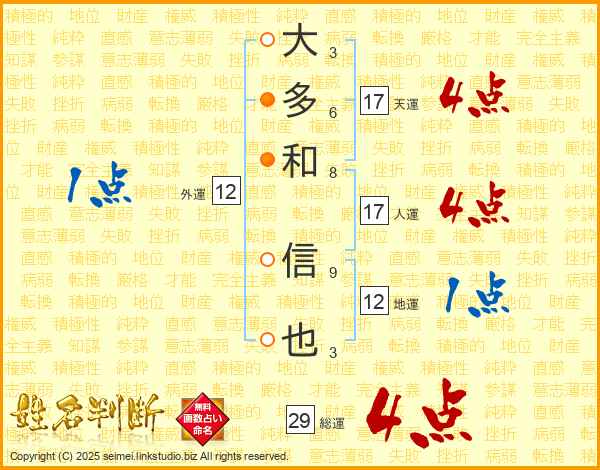 生活面を象徴する運勢です。外部から受ける影響力を表し、結婚運、家庭運や職場、環境への順応性を表します。総運から人運を引いた画数。姓や名が1文字の場合を除く。