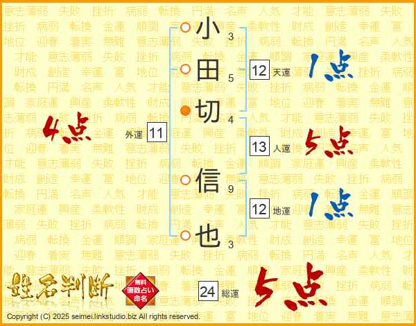小(3画)田(5画)切(4画) 信(9画)也(3画)