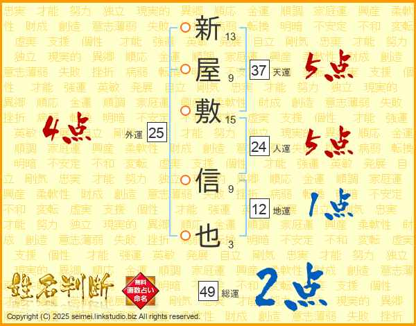 新(13画)屋(9画)敷(15画) 信(9画)也(3画)