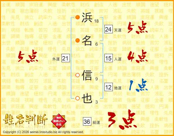浜(18画)名(6画) 信(9画)也(3画)