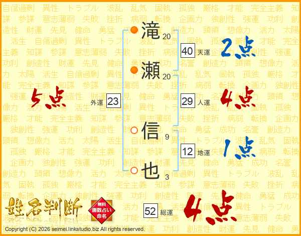 滝(20画)瀬(20画) 信(9画)也(3画)