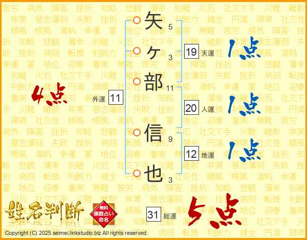 矢(5画)ヶ(3画)部(11画) 信(9画)也(3画)