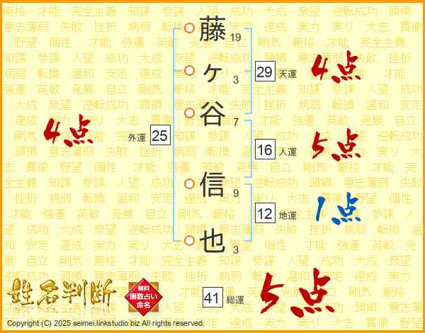 藤ヶ谷信也さんの総運は41画の5点!
