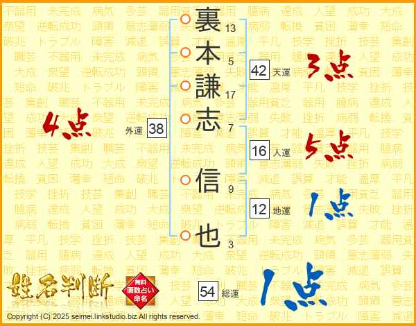 裏(13画)本(5画)謙(17画)志(7画) 信(9画)也(3画)