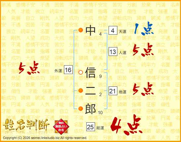 生活面を象徴する運勢です。外部から受ける影響力を表し、結婚運、家庭運や職場、環境への順応性を表します。総運から人運を引いた画数。姓や名が1文字の場合を除く。