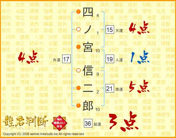 四(4画)ノ(1画)宮(10画) 信(9画)二(2画)郎(10画)