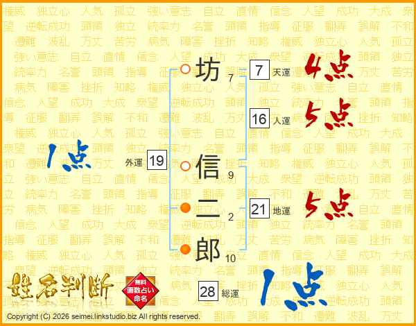 画数の奇数(○陽)と偶数(●陰)の配列で吉凶を占います。どちらかにかたよる名前は大凶名で避ける必要があります。画数の奇数偶数。