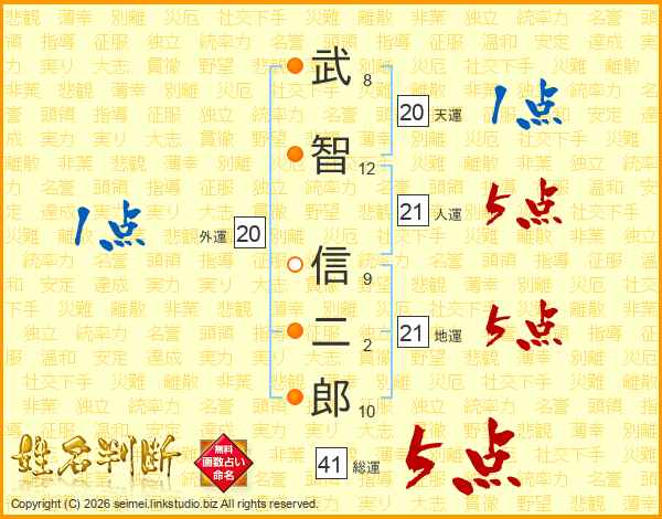 武(8画)智(12画) 信(9画)二(2画)郎(10画)