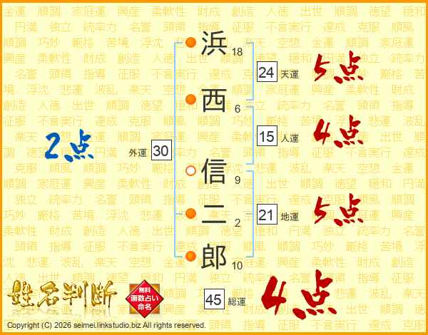 浜(18画)西(6画) 信(9画)二(2画)郎(10画)