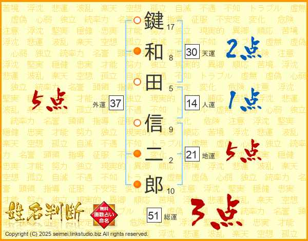 鍵(17画)和(8画)田(5画) 信(9画)二(2画)郎(10画)