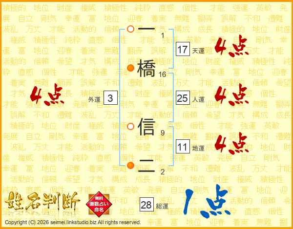 あなたの人生を表す1番重要な運勢です。生涯を通じて影響する総合運となり、主に50歳以降の晩年期に影響を及ぼします。苗字と名前の合計画数。