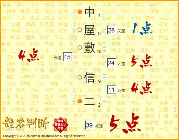 中屋敷信二さんの総運は39画の5点!