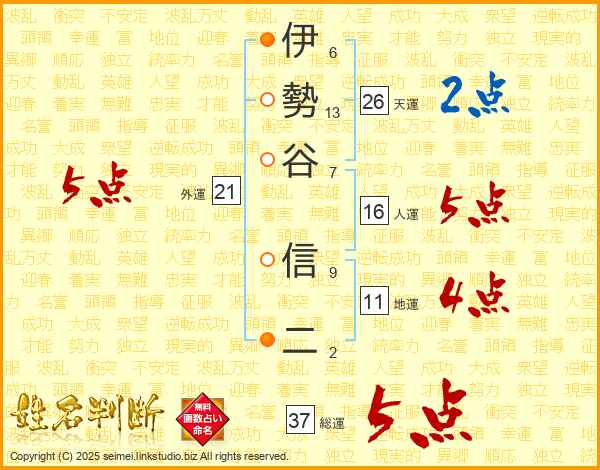 伊(6画)勢(13画)谷(7画) 信(9画)二(2画)