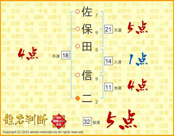 佐(7画)保(9画)田(5画) 信(9画)二(2画)