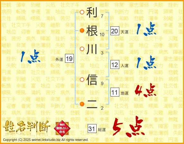 利(7画)根(10画)川(3画) 信(9画)二(2画)