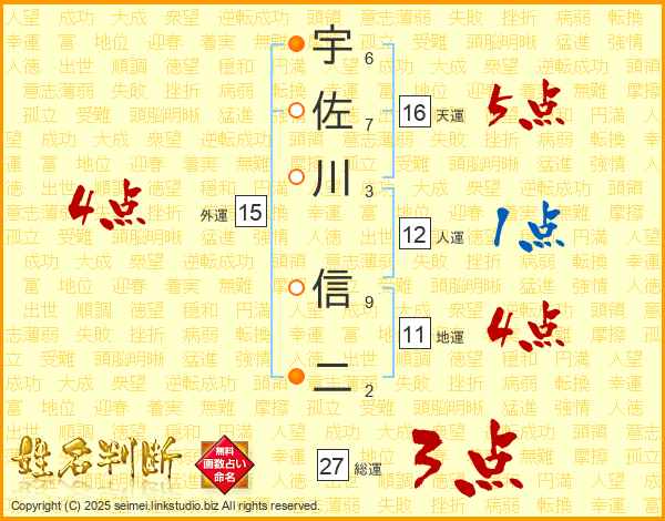 宇(6画)佐(7画)川(3画) 信(9画)二(2画)