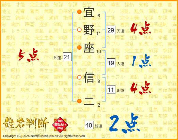 宜(8画)野(11画)座(10画) 信(9画)二(2画)