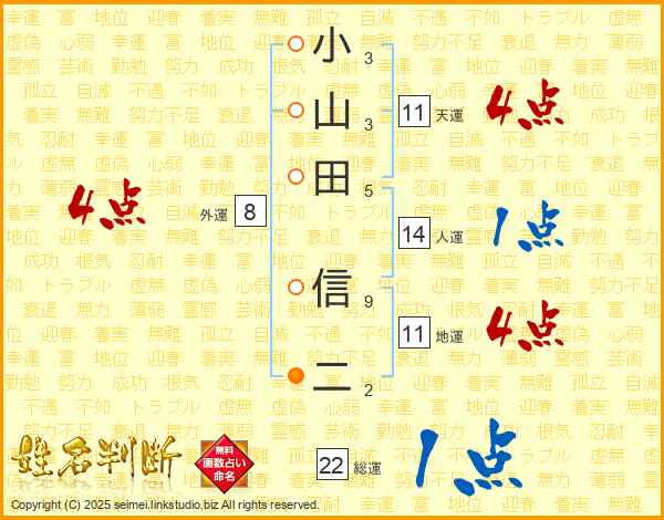 小(3画)山(3画)田(5画) 信(9画)二(2画)