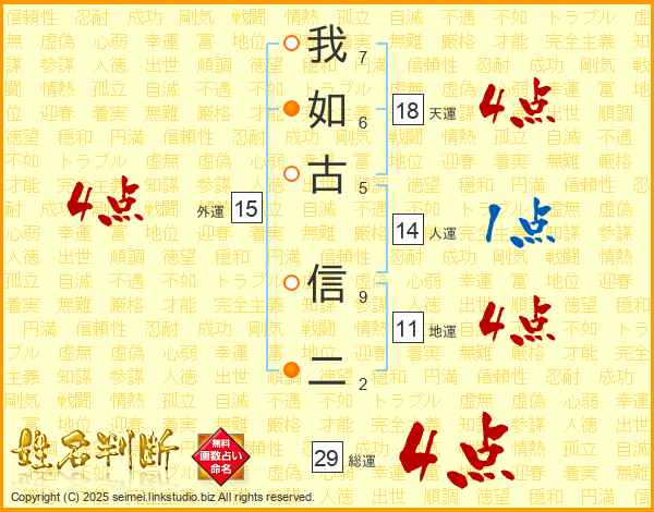 我如古信二さんの総運は29画の4点!