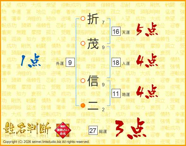 あなたの人生を表す1番重要な運勢です。生涯を通じて影響する総合運となり、主に50歳以降の晩年期に影響を及ぼします。苗字と名前の合計画数。