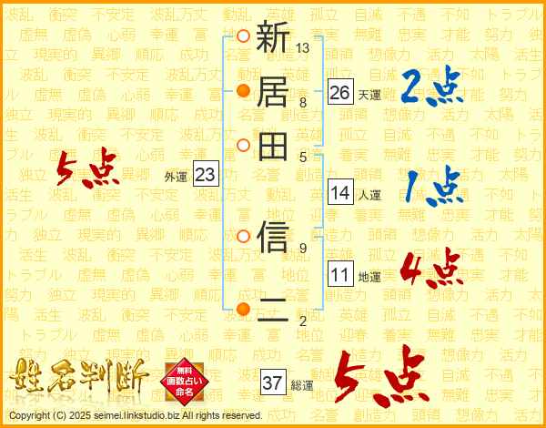 新(13画)居(8画)田(5画) 信(9画)二(2画)