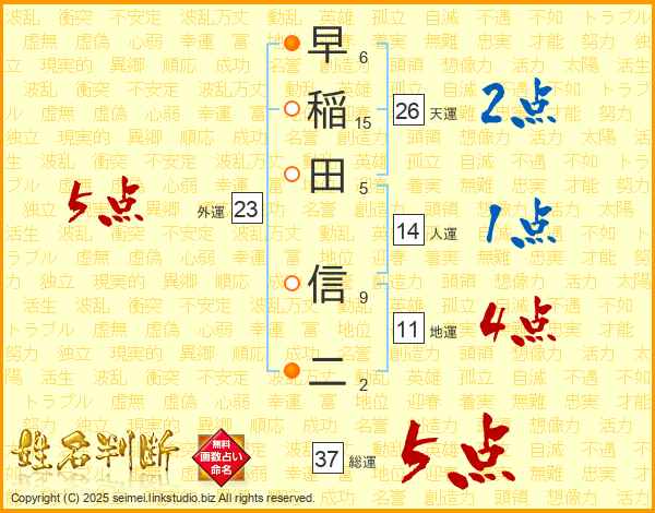 早(6画)稲(15画)田(5画) 信(9画)二(2画)