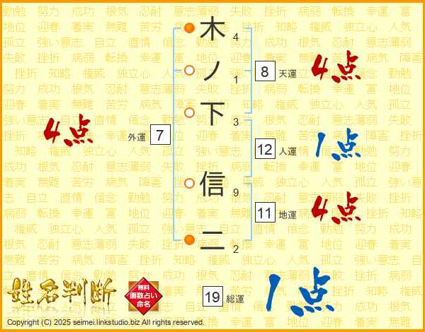 木(4画)ノ(1画)下(3画) 信(9画)二(2画)